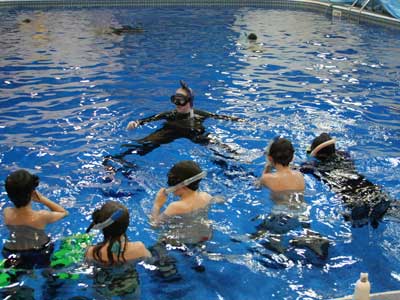 This program introduces children to the experience of the underwater world. Under close supervision, participants swim around on scuba equipment in the shallow, confined water of our pool.